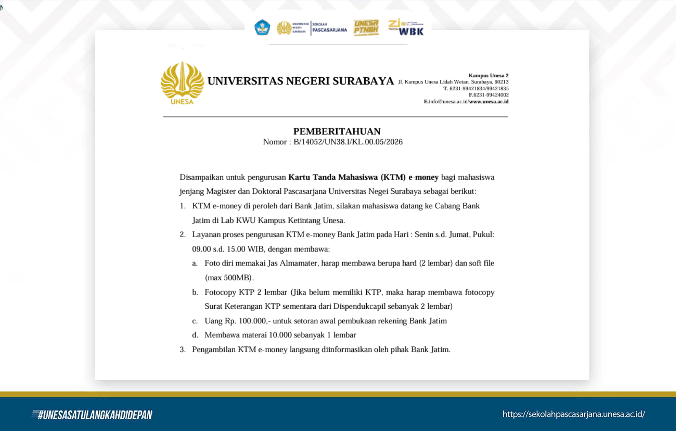 The Graduate School of Surabaya State University has issued a notice regarding the e-Money Student Identity Card (KTM) processing for Master's and Doctoral students, as outlined in the Notification Letter from the Vice Rector for Field I Number B/