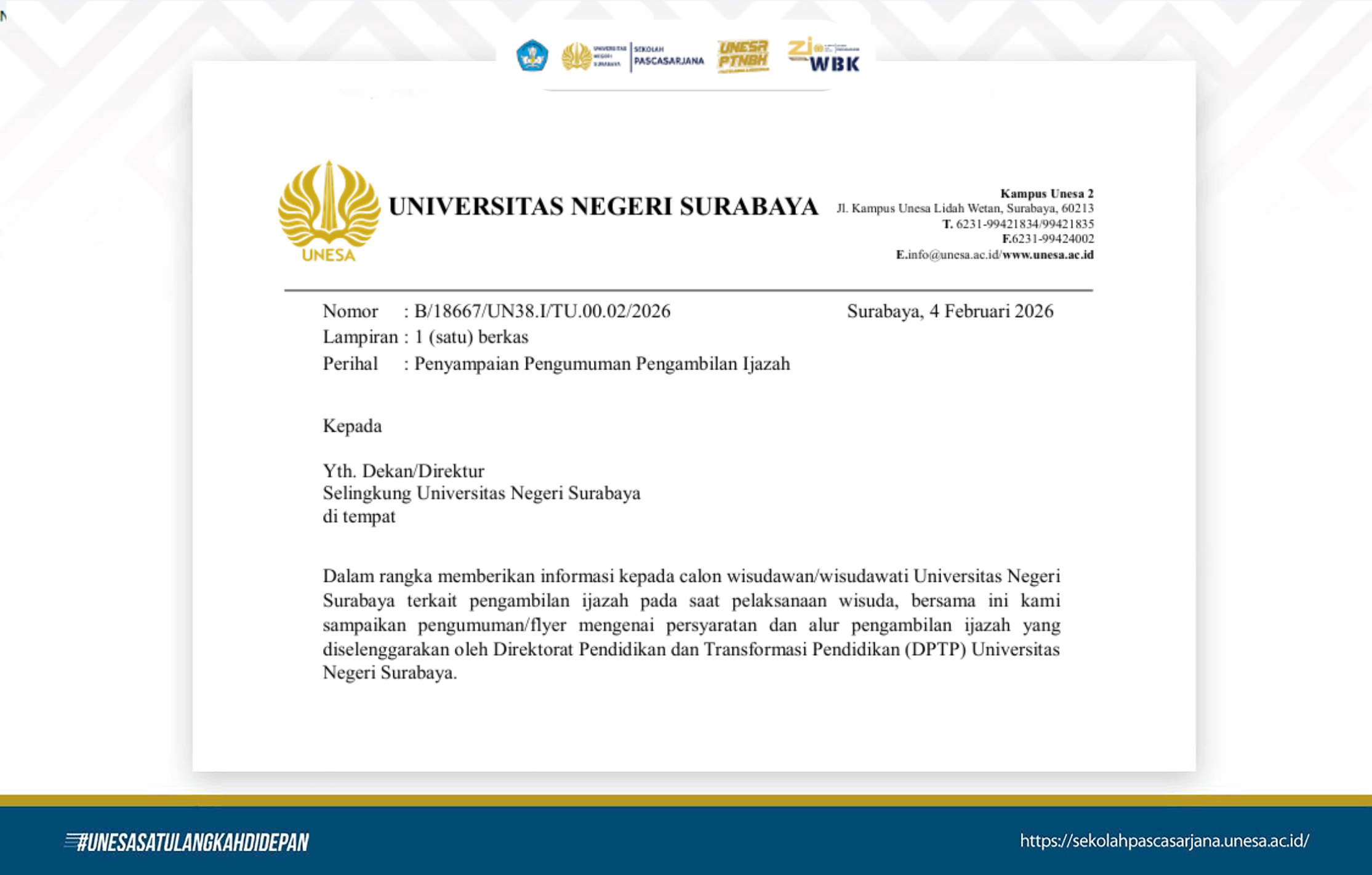 The Graduate School of Surabaya State University has announced the Graduation Ceremony Announcement, as stated in the Letter from the Vice Rector for Field I Number B/18667/UN38.I/TU.00.02/2026. Students and graduates are expected to carefully rev
